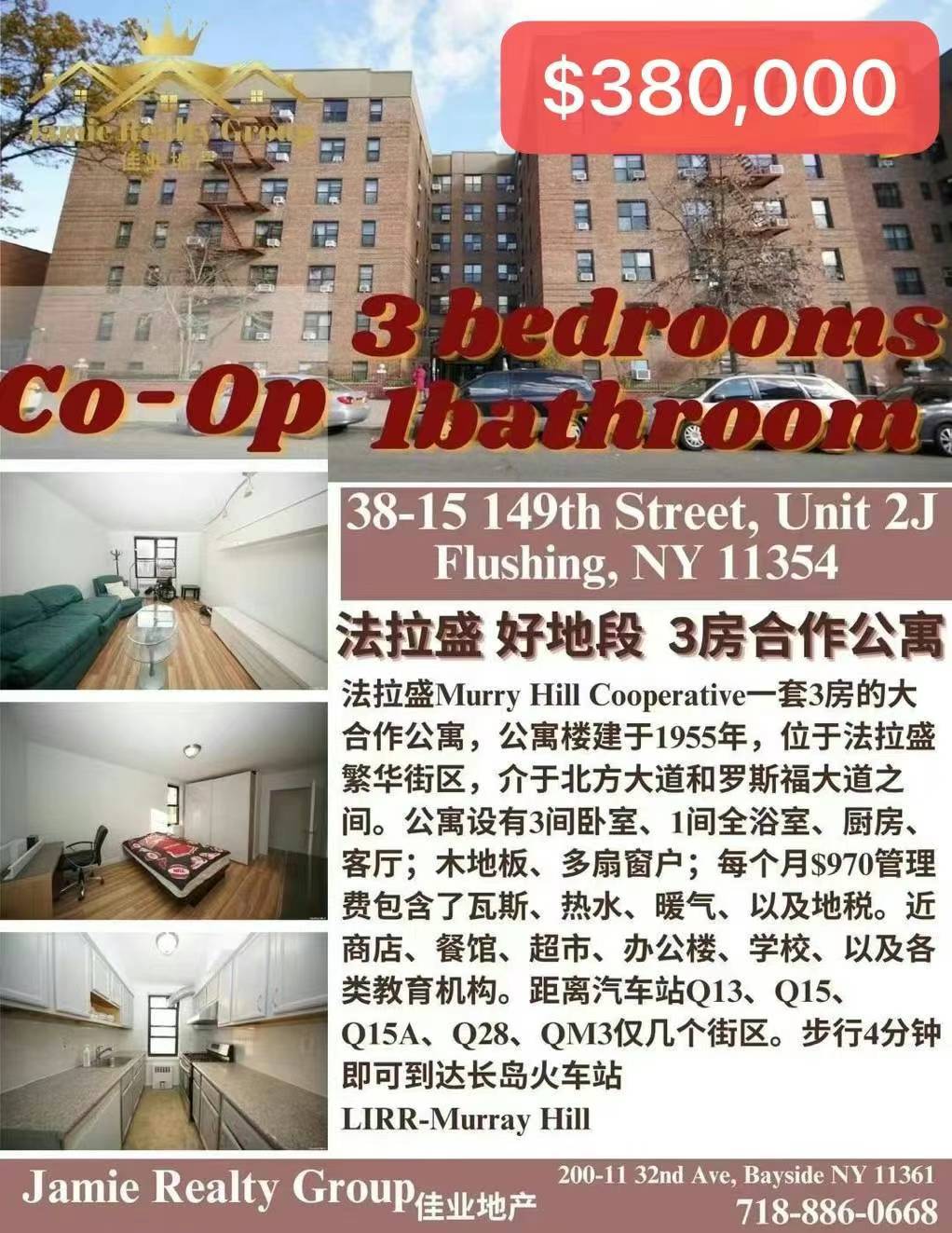 位于法拉盛Northern Blvd和Roosevelt Ave之间繁荣社区的Murry Hill合作社,拥有三间大卧室。硬木地板,宽敞的客厅配有多扇窗户,维护费包括煤气、热水、暖气和房产税。靠近商店、餐厅、超市、专业办公室、学校和教育中心。距离Q13, Q15, Q15A, Q28, QM3公交车几个街区之遥。步行四分钟可达LIRR。管理费$970, $38万 现金买家优先。
