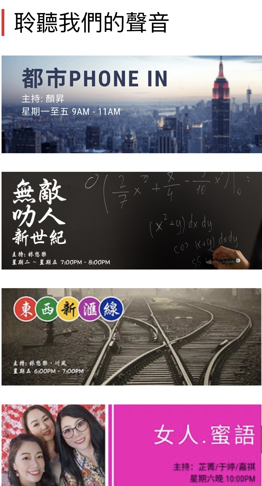 紐約華語廣播的節目以快速步伐為聽眾提供新聞,金融,天氣,交通,娛樂,社區服務等綜合內容。