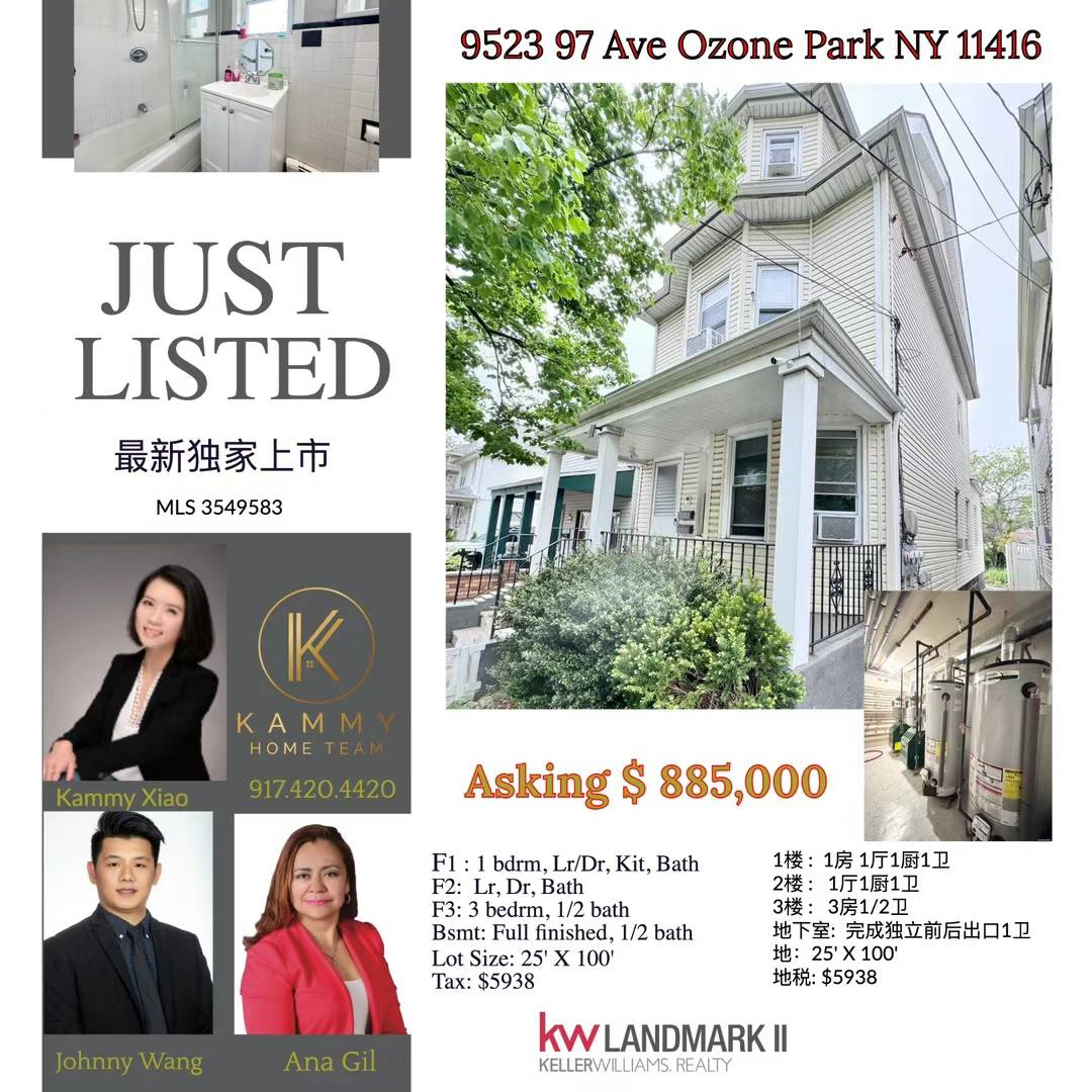 9523 97 Ave Ozone Park NY 11416. 独立两家庭,地面三层+完成地下室. 2套热水与暖气,一流自住及投资、叫价88万5. 详情请联系肖小姐9174204420