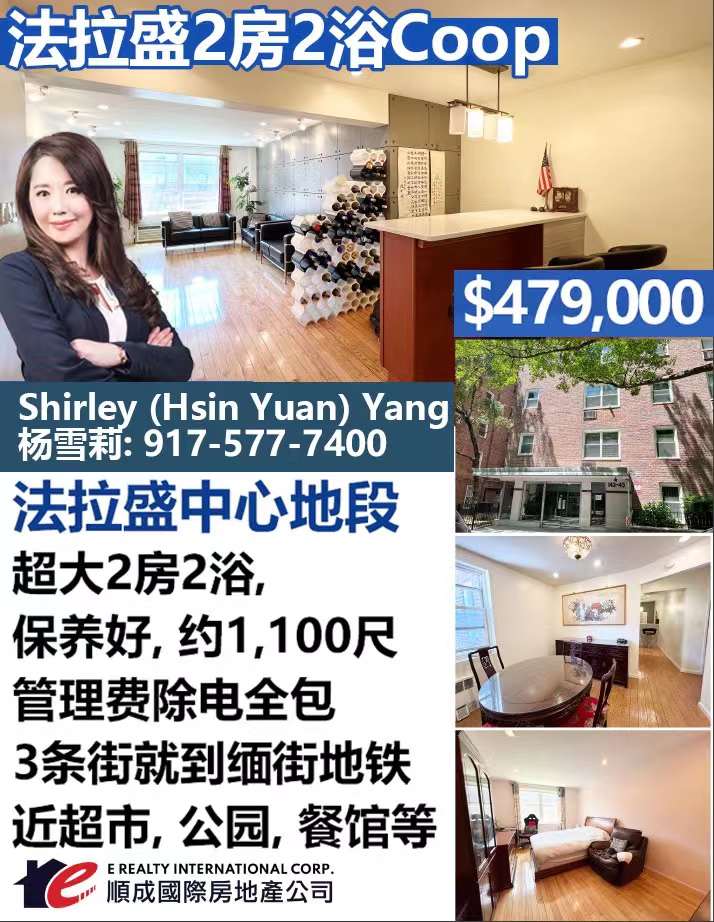 維持費$1177.22 每月除電全包,保養一流 步行緬街地鉄 超市 商場 有興趣的朋友們請聯絡順成房地產 售 $479,000 楊雪莉646-688-8998