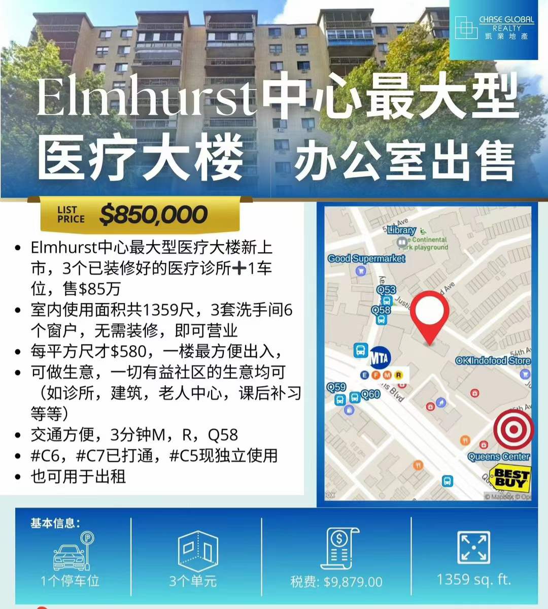 室内使用面积共1359尺,3套洗手间6个窗户,无需装修,即可营业,每平方尺才$580,一楼最方便出入,性价比超高,一切有益社区的生意均可(如诊所,建筑,老人中心,课后补习等等)3分钟M,R,Q58,也可出租,#C6,#C7已打通,#C5现独立使用