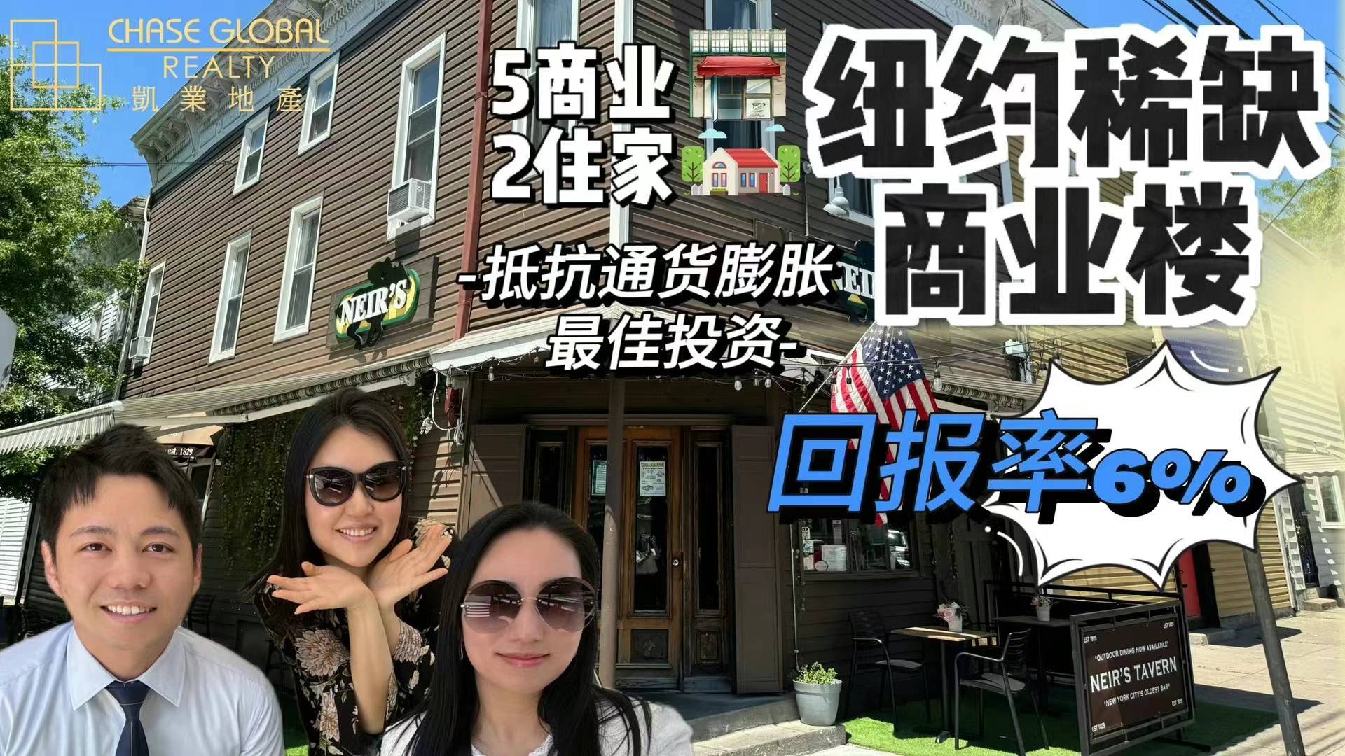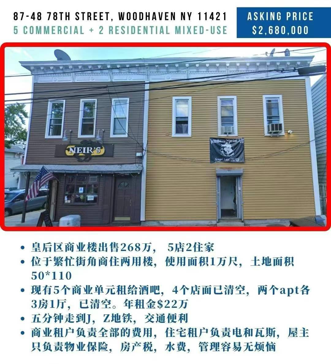 位于繁忙街角商住两用楼,使用面积1万尺,土地面积50*110,现有5个商业单元,租给酒吧,4个店面已清空。两个apt各3房1厅,已清空。年租金可达$22万。回报率6%。