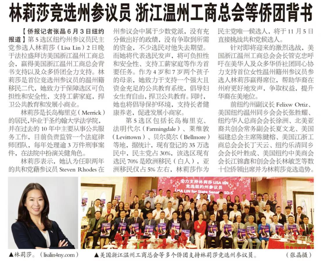 受到众多乡亲们和侨团全力支持与背书。林莉莎是我们首位温州藉的女儿竞选州参议员,她有深厚法学背景及十多年在法院工作的经验。值得我们信任的。开创了温州人的先河,是年轻人的榜样能带动更多人参与。她的参政是我们温州人的骄傲更是整个华人自豪,请大家转告亲朋好友有住在District 5(Nassau County)2024年11 月5日出来全力支持Lisa Lin投上您宝贵的神圣一 票,这不仅仅是投Lisa Lin 更是投给我们自己的下一代谢谢