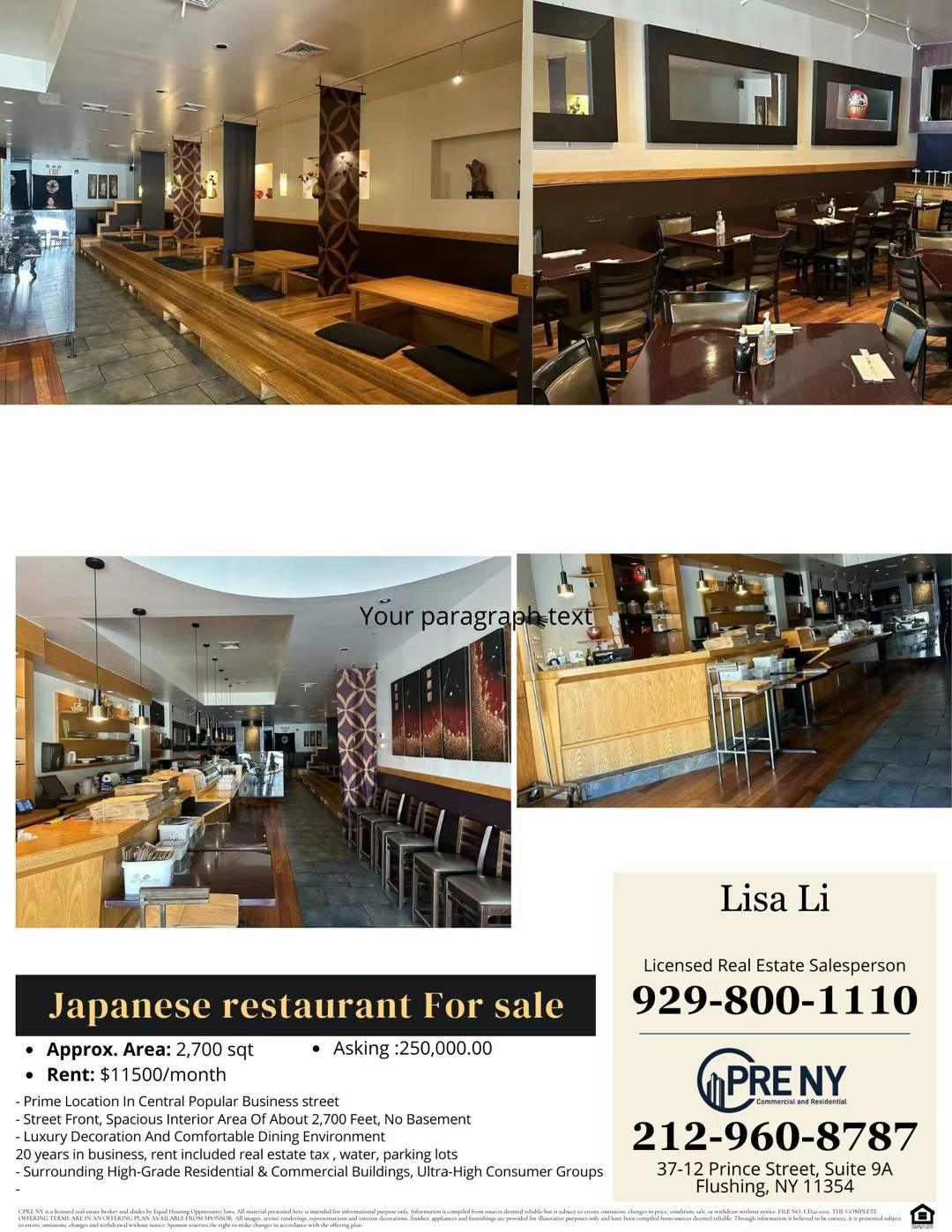 生意8万/月, 65%店吃,店面2700尺+楼上小仓库,asking 21万,租金$11500/月,包地税,水费,lease 13年剩余(3+10)