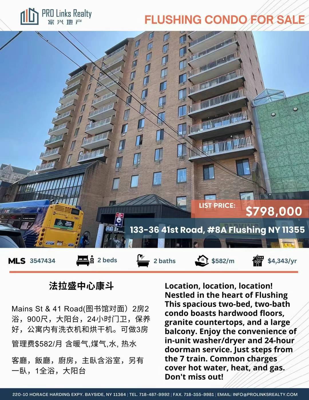 法拉盛康斗2房2浴,900尺,大阳台,24小时门卫,保养好,公寓内有洗衣机和烘干机。可做3房管理费$582/月 含暖气,煤气,水, 热水地税$4,343/年🧧售$79万8🏠客廳,飯廳,廚房,主臥含浴室,另有一臥,1全浴,大阳台 🚌交通便利 Q25, Q34, Q27, Q17sarah 孙小姐 646-920-8373