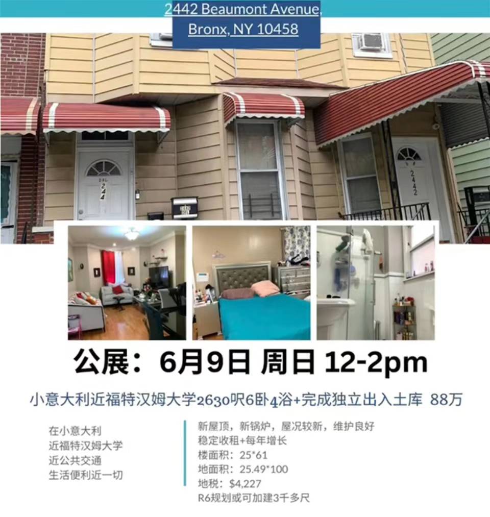 本周日12-2pm第一次公展:新上市,布朗士小意大利区独立2家庭6卧4浴2630呎+地下室2房1卫,新屋顶,新锅炉,屋况好收租机器,R6规划,屋25*61,地25.5*100,超低地税4227块,步行福特汉姆大学,与植物园动物园一墙之隔,地下室已清空,目前1楼2楼收租5650块/月,每年加租,开价88 (Zillow 估价99),地址:2442 Beaumont Avenue, Bronx, NY 10458