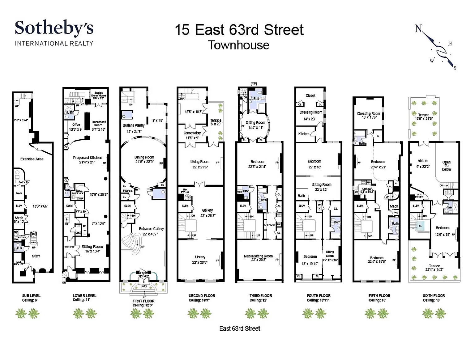 纽约曼哈顿豪华公寓这座罕见的纽约镀金时代石灰石美术风格豪宅之一,共7卧16浴 18,000尺, 精致而华丽,是一座闪闪发光的幸存者,是上东区仅存的、建筑上最完整的镀金时代辉煌建筑之一。 地理位置优越,紧邻第五大道和中央公园,第五大道和麦迪逊大道之间,位于著名的东 63 街,是由 CPH Gilbert、D & J Jardine 和 Delano & Aldrich 等伟大建筑师设计的美丽豪宅中一组令人惊叹的外墙的一部分,为 Woolworth、Bloomindale、Brokaw、Oscar Hammerstein 等著名居民以及 Neil Diamond 等当今居民改造该街区。 世界上最独特的购物区之一距麦迪逊大道仅几步之遥,云集了 Graff、Hermes、Lalique、Dolce & Gabbana 和 Maison Goyard 等品牌。 这座联排别墅由金融家兼慈善家埃利亚斯·阿西尔 (Elias Asiel) 于 1901 年建造,是建筑师约翰·H·邓肯 (John H. Duncan) 的杰作,邓肯是世纪之交最重要的建筑师之一,也是格兰特墓的设计者。令人想起巴黎的豪宅,非凡的石灰岩外墙设有中心入口和次入口,有精致的花环、拱形法式窗户、铜折线屋顶和三个露台,其中两个屋顶露台可欣赏壮丽的城市和中央公园景观。 联排别墅面积为 25' 宽 x 100' 深,占地 25' x 100',采用钢梁结构,每层都有电梯,面积约 18,000 平方英尺,共 8 层,其中地上 6 层,28 间客房, 7 间卧室、8 间浴室、4 间化妆间和 14 个壁炉。联排别墅的房间规模宏大,天花板高耸,比例优美,装饰丰富,工艺非凡。一楼:46' x 22' 入口画廊配有白色大理石地板、12' 天花板和壮观的弧形白色大理石楼梯,通向一个独特的圆形餐厅,通过美丽的玻璃门进入,并提供人字形地板、壁炉、12' 天花板、并且位于管家的厨房之外。二楼:巨大的 25' x 22' 画廊,天花板高 16'9',北侧是 22' x 21' 客厅,拥有非凡的 16'9' 天花板、人字形地板、壁炉和带装饰的装饰线条。天花板的每个角落都有漩涡花饰,门通向露台。 客厅旁边有一个温室,有通往露台的门。 画廊南侧是镶板图书馆,面积为 22 英尺 x 20 英尺,天花板高度为 16 英尺 9 英寸,设有人字形地板、壁炉,每个角落都有带有雕塑图案的装饰天花板。三楼:客厅/媒体室,配有人字形地板、壁炉、12 英尺高的天花板和套间浴室。主卧室面积为 22' x 21',设有壁炉、12' 天花板、带壁炉的客厅和套间浴室。 四楼:带壁炉的卧室、10'11' 天花板、通往带壁炉的客厅的双门、套间浴室。北卧室面积为 22' x 18',设有壁炉、10'11' 天花板、客厅、更衣室、步入式衣柜、套间浴室、小厨房、洗衣房。 五楼:双高、23' x 21' 客厅通向楼上,设有壁炉和两扇双高拱形窗户,光线充足。两间卧室,其中一间带壁炉,两间卧室均设有 10 英尺高的天花板、套间浴室和相邻的小厨房。 六楼:可爱的朝南卧室,配有壁炉、10 英尺天花板、套间浴室和通往大露台的双门,可欣赏中央公园和城市景观。北侧的中庭俯瞰着下面的楼层,通向一个露台,可以欣赏到中央公园和城市景观,包括卡莱尔酒店的塔楼。 下层:11' 天花板,拟建厨房,21' x 21',带现有壁炉、早餐室、带壁炉的客厅、小厨房、办公室、英式温室、浴室和化妆间、街道入口。 底层:设有 8 英尺高天花板的运动区、化妆间、员工宿舍、小厨房、储藏室和机械设备。$65,000,000