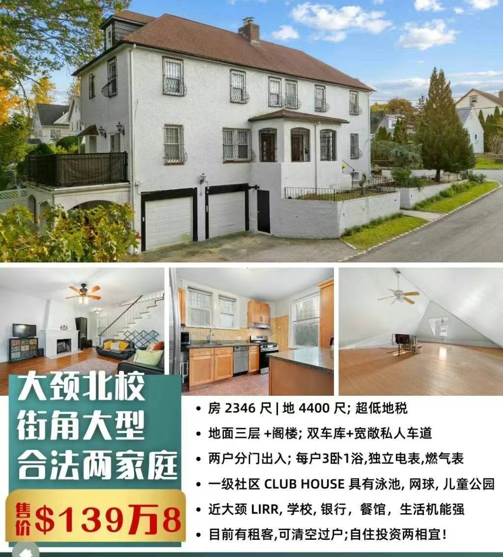 长岛大颈房子出售 Long Island NY💙大颈北校街角大型合法两家庭