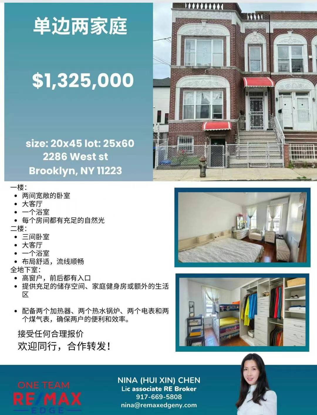 布鲁克林房子出售 Brooklyn NY布碌仑单边两家庭$1,325,000