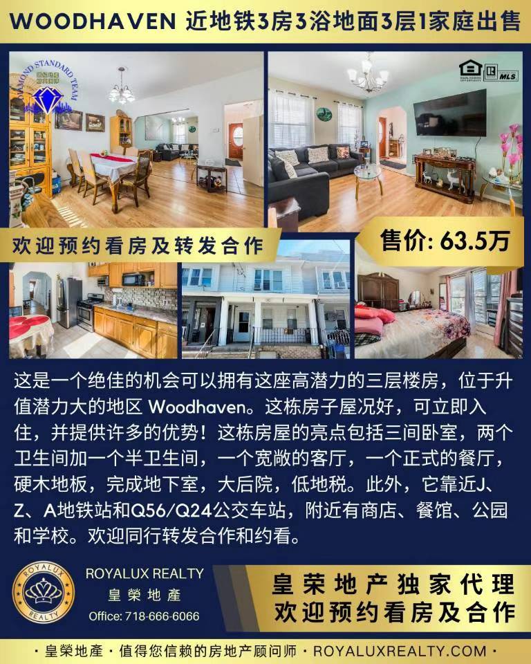 这是一个绝佳的机会可以拥有这座高潜力的三层楼房,位于升值潜力大的地区 Woodhaven。这栋房子屋况好,可立即入住,并提供许多的优势!这栋房屋的亮点包括三间卧室,两个卫生间加一个半卫生间,一个宽敞的客厅,一个正式的餐厅,硬木地板,完成地下室,大后院,低地税。此外,它靠近J、Z、A地铁站和Q56/Q24公交车站,附近有商店、餐馆、公园和学校。欢迎同行转发合作和约看
