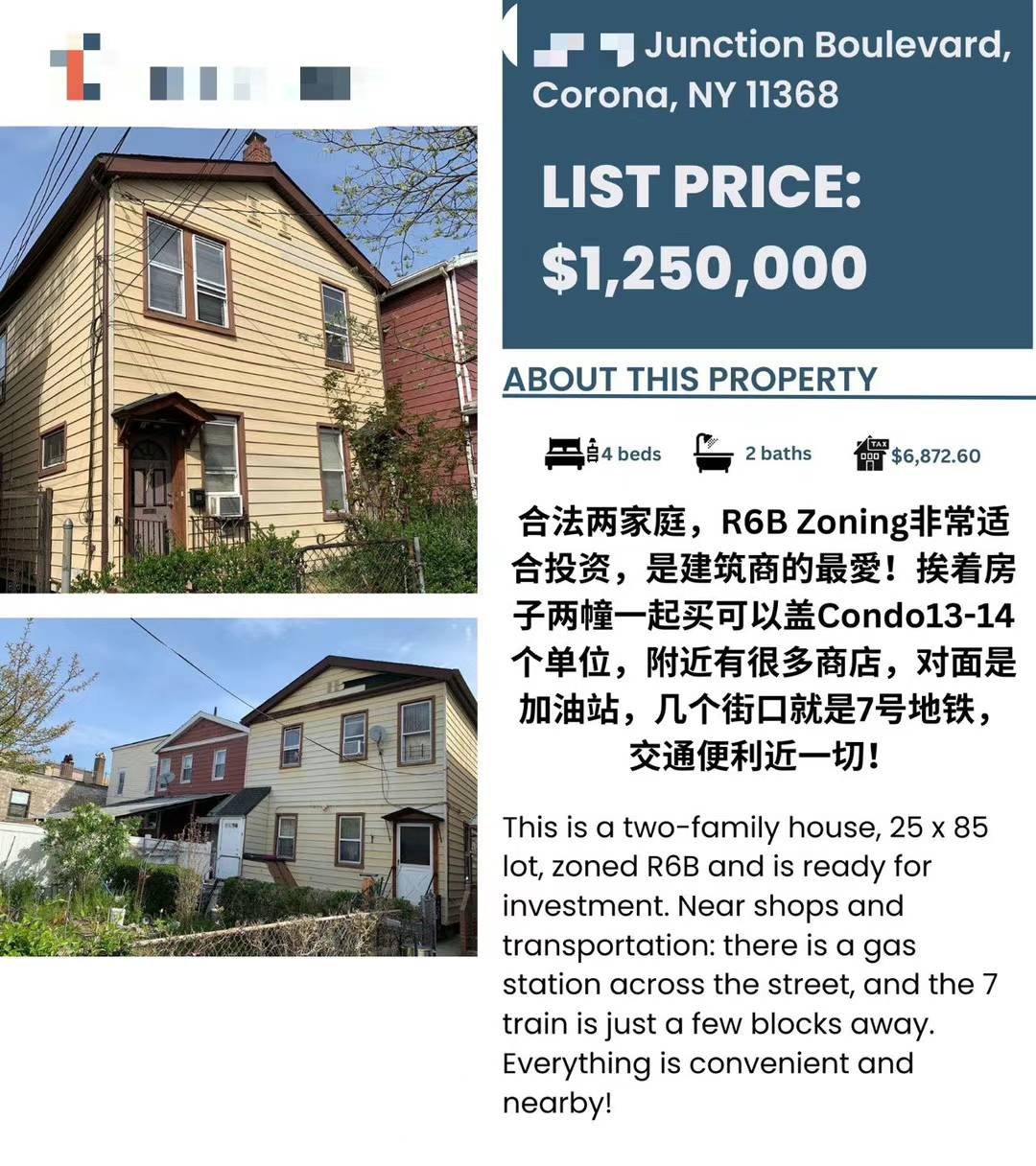 R6B Zoning非常适合投资,是建筑商的最愛!挨着房子两幢一起买可以盖Condo 13-14个单位,附近有很多商店,对面是加油站,几个街口就是7号地铁,交通便利近一切!请联系 9298880202