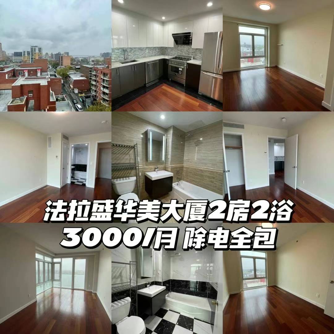 华美大厦2房2浴高楼层,角落单位,有阳台采光好,空气好,风景好有门卫,健身房,大楼有洗衣干衣设备3000/月 除电全包查信用收入免宠 929 345 5800