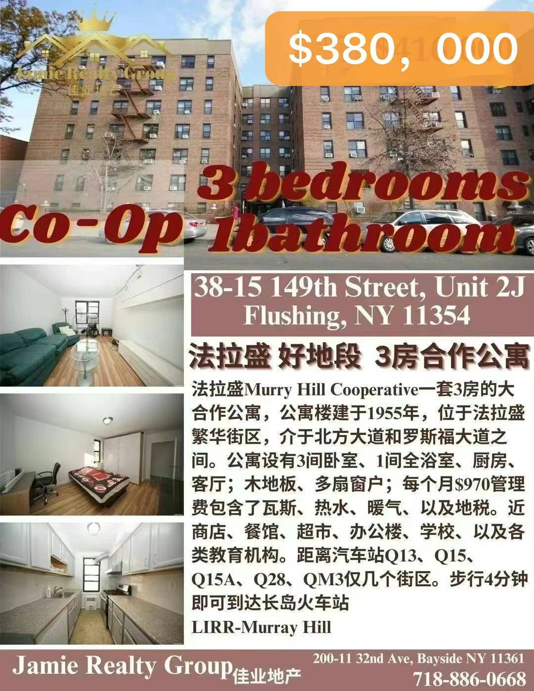 优越的地理位置,位于法拉盛Northern Blvd和Roosevelt Ave之间繁荣社区的Murry Hill合作社,拥有三间大卧室,有电梯🛗。硬木地板,宽敞的客厅配有多扇窗户,维护费包括煤气、热水、暖气和房产税。靠近商店、餐厅、超市、专业办公室、学校和教育中心。距离Q13, Q15, Q15A, Q28, QM3公交车几个街区之遥。步行四分钟可达LIRR。管理费$970, $38万