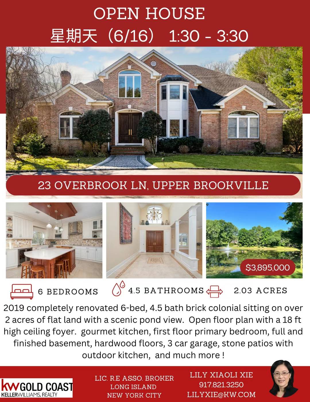 🎈学区: 长岛北岸十分好学区。周边有著名的纽约长岛大学(LIU)和纽约科技大学。【星期天公展】时间:6/16 下午1:30~3:30地址:23 Overbrook Ln, Upper Brookville
