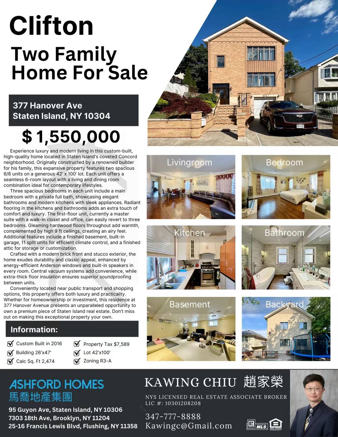 Experience luxury in this custom-built Staten Island home in Clifton. Featuring two spacious 6-room units, each with three bedrooms, modern kitchens, and elegant bathrooms. Highlights include hardwood floors, high ceilings, a finished basement, built-in garage, 11 split units, and a finished attic. The home features a modern brick and stucco exterior, energy-efficient windows, built-in speakers, and central vacuum systems. Conveniently located near public transport and shopping, it's perfect for homeownership or investment.