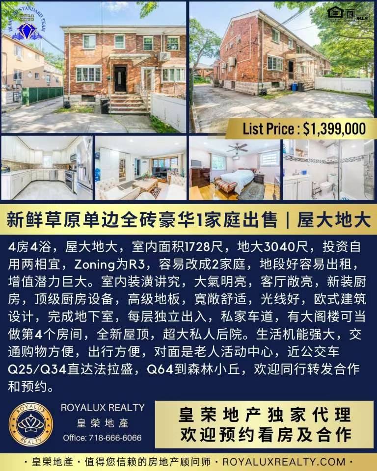 4房4浴,屋大地大,室内面积1728尺,地大3040尺,投资自用两相宜,Zoning为R3,容易改成2家庭,地段好容易出租,增值潜力巨大。室内装潢讲究,大氣明亮,客厅敞亮,新装厨房,顶级厨房设备,高级地板,寬敞舒适,光线好,欧式建筑设计,完成地下室,每层独立出入,私家车道,有大阁楼可当做第4个房间,全新屋顶,超大私人后院。生活机能强大,交通购物方便,出行方便,对面是老人活动中心,近公交车Q25/Q34直达法拉盛,Q64到森林小丘,欢迎约看。